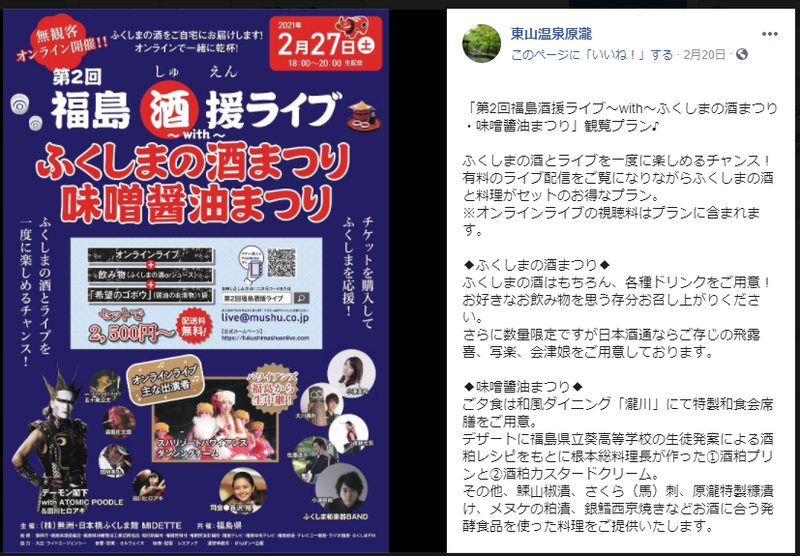 2月27日(土)18:00から開催された「酒援ライブ 原瀧会場」にて、箸初めとして家庭クラブ考案の酒粕レシピ「酒粕ディップ」が提供されました。